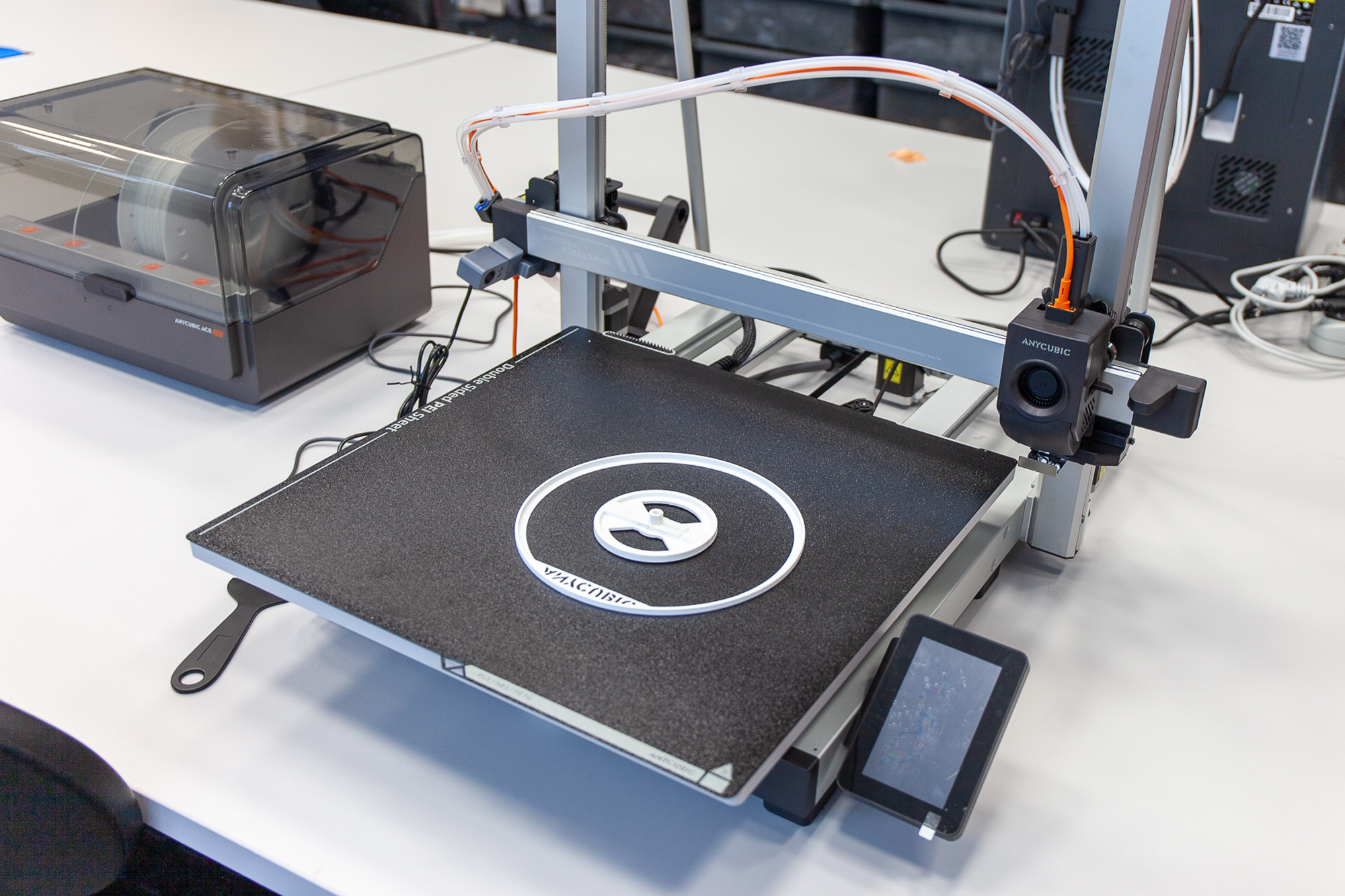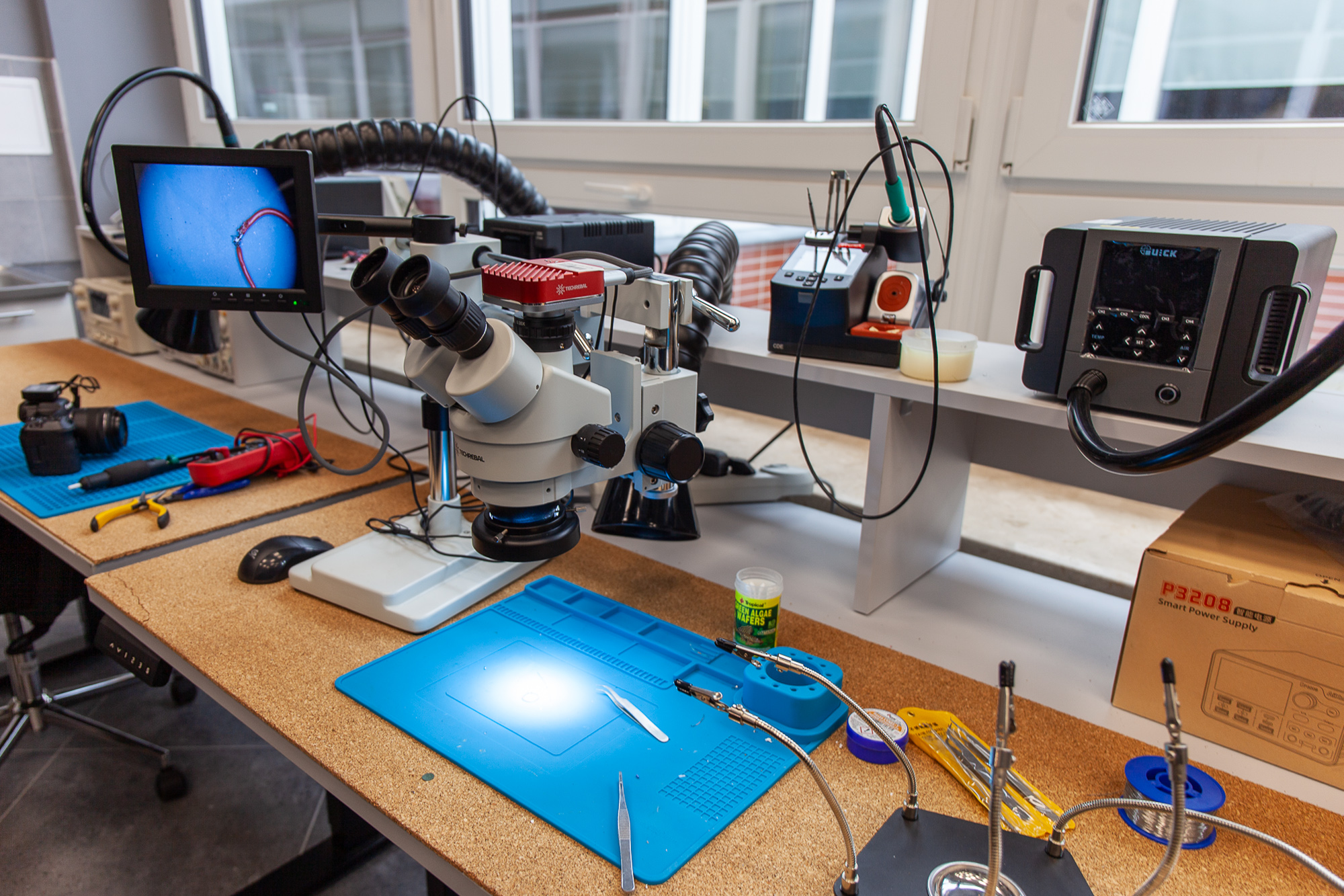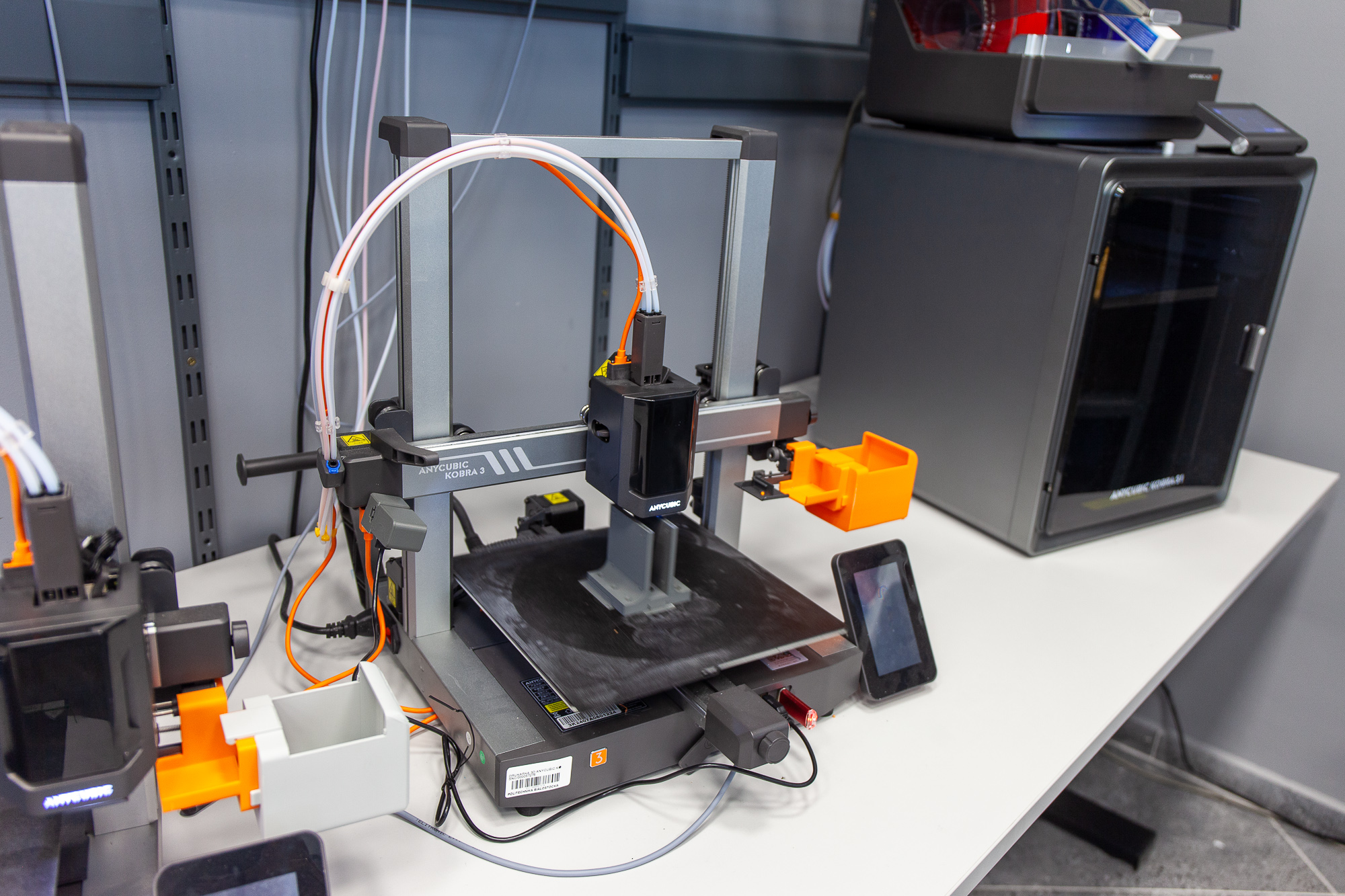 W Prototypowni znajdują się m.in. drukarki 3D różnych typów (FFF/FDM, SLA/DLP), stanowiska do lutowania i prototypowania elektroniki, oscyloskopy, zasilacze laboratoryjne i analizatory logiczne, a także stoły warsztatowe z pełnym zapleczem narzędzi oraz stanowiska komputerowe CAD/CAE. W magazynie materiałów dostępne są filamenty i żywice do druku, elementy złączne, łożyska, komponenty elektroniczne i przewody – wszystko, co potrzebne, by szybko przejść od pomysłu do działającego modelu.
