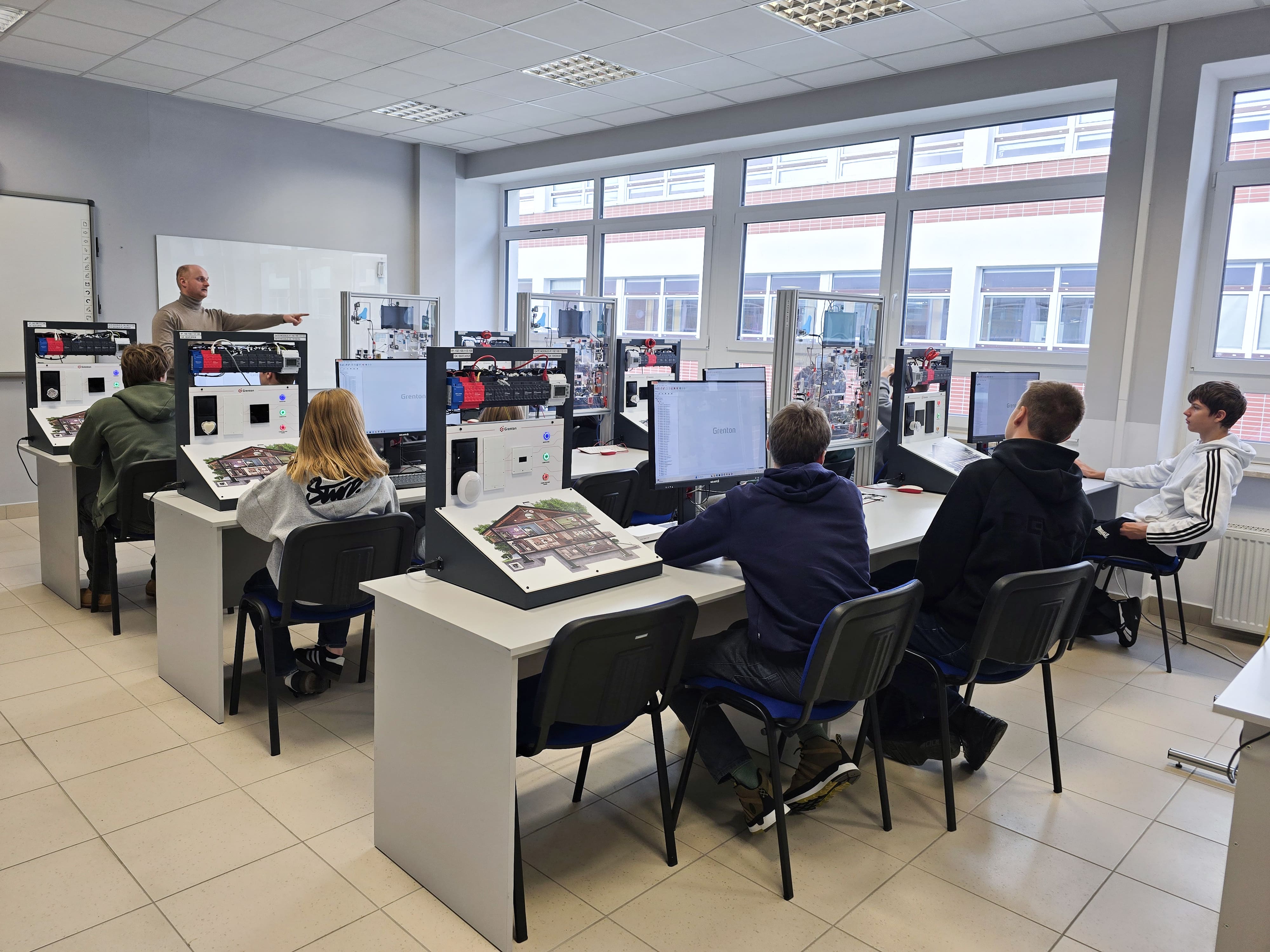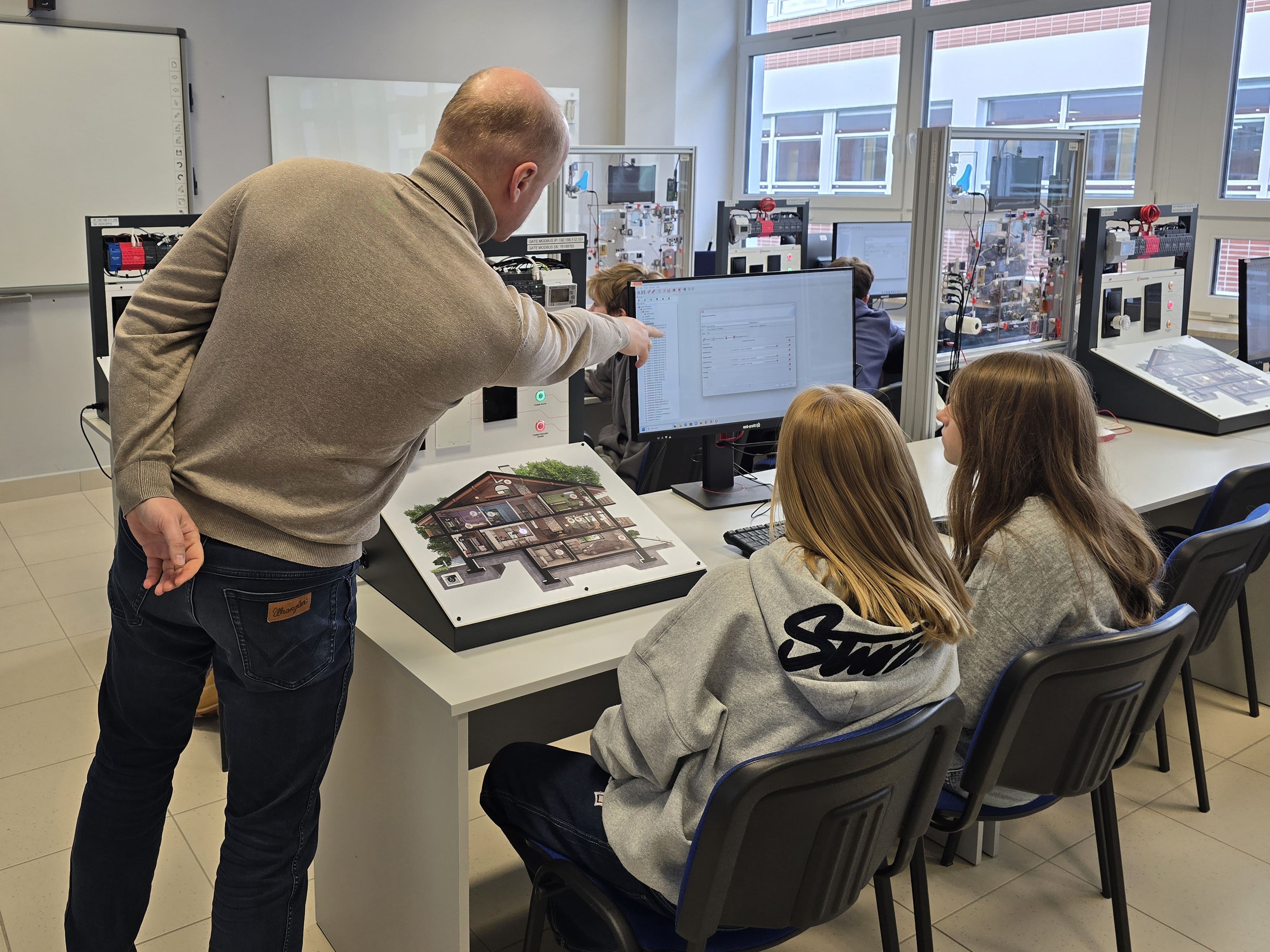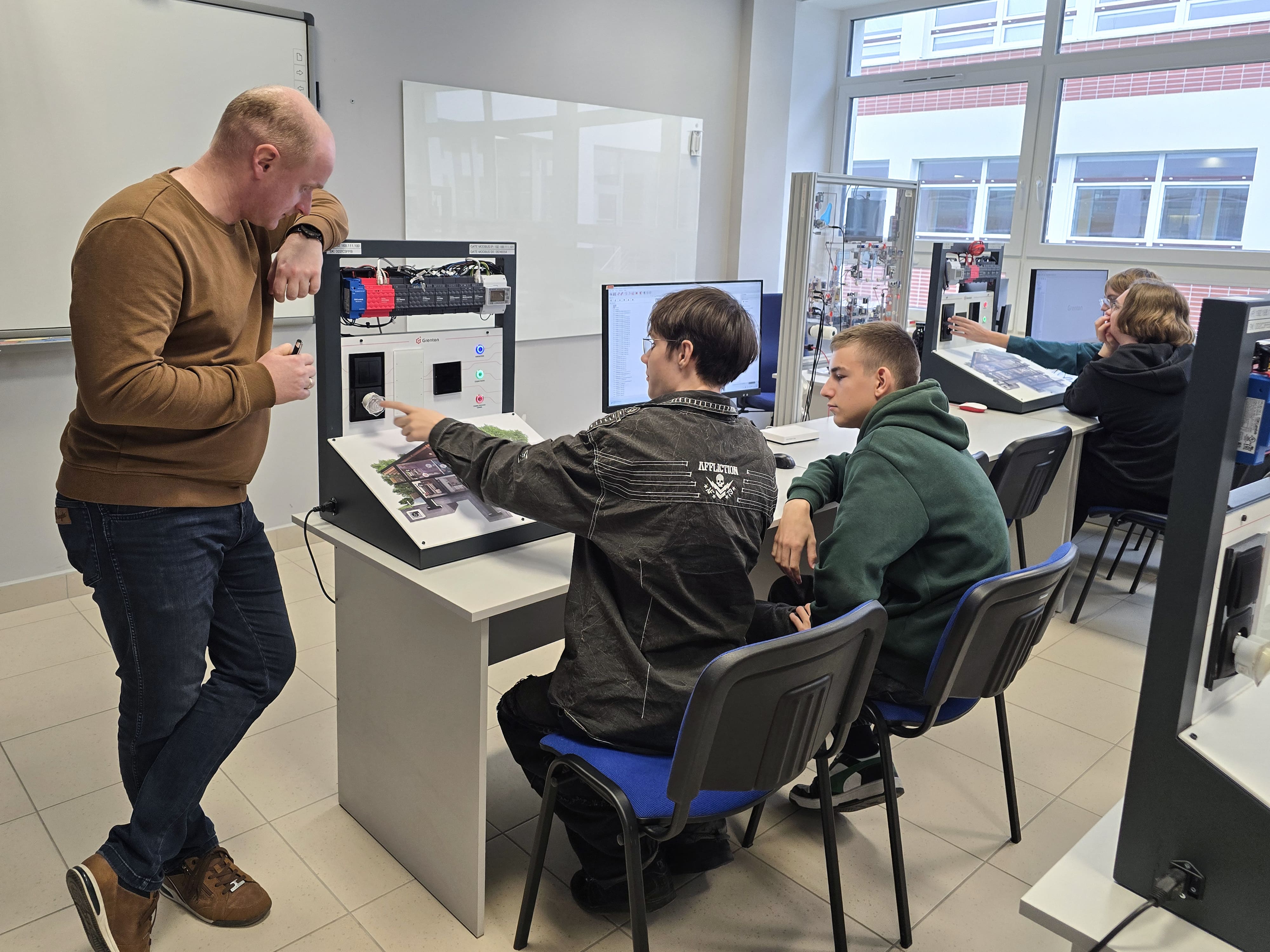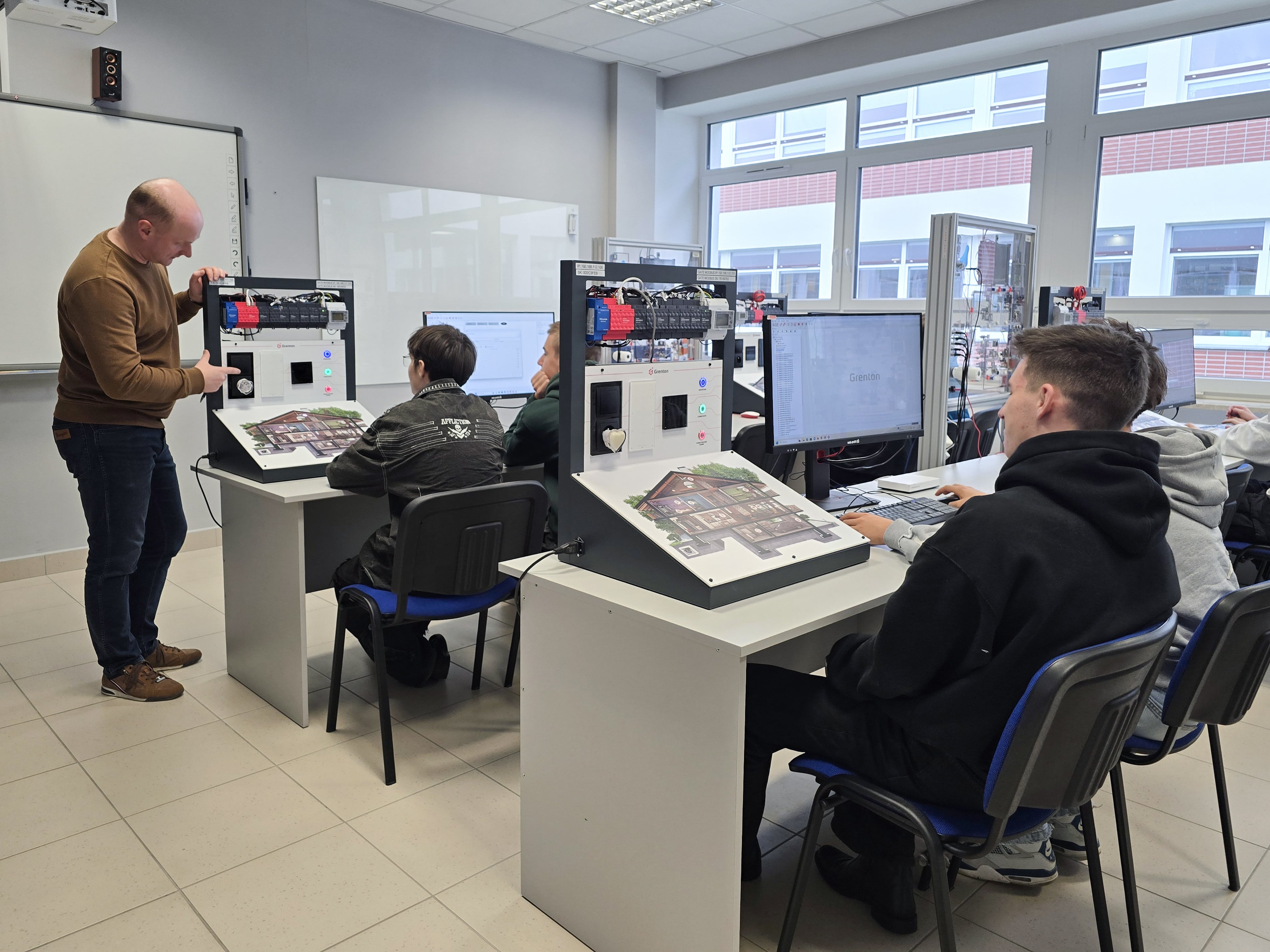 Prowadzący warsztaty mgr inż. Błażej Bartoszewicz opowiadał na temat systemów inteligentnych w budynkach, wskazał na ich zalety oraz programowanie. Uczniowie wzięli udział w zajęciach z wykorzystaniem Systemu Grenton.